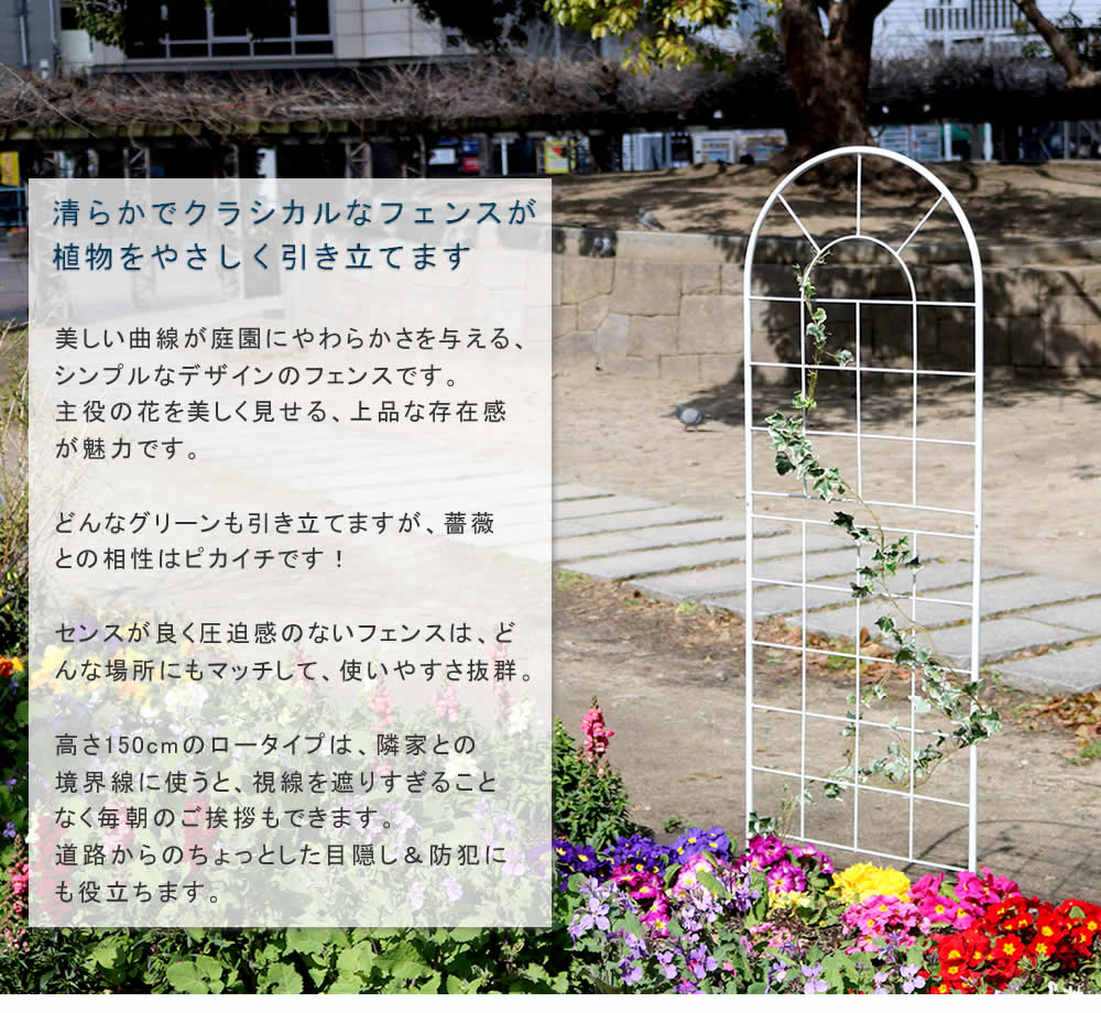 清らかでクラシカルなフェンスが植物をやさしく引き立てます美しい曲線が庭園にやわらかさを与える、シンプルなデザインのフェンスです。